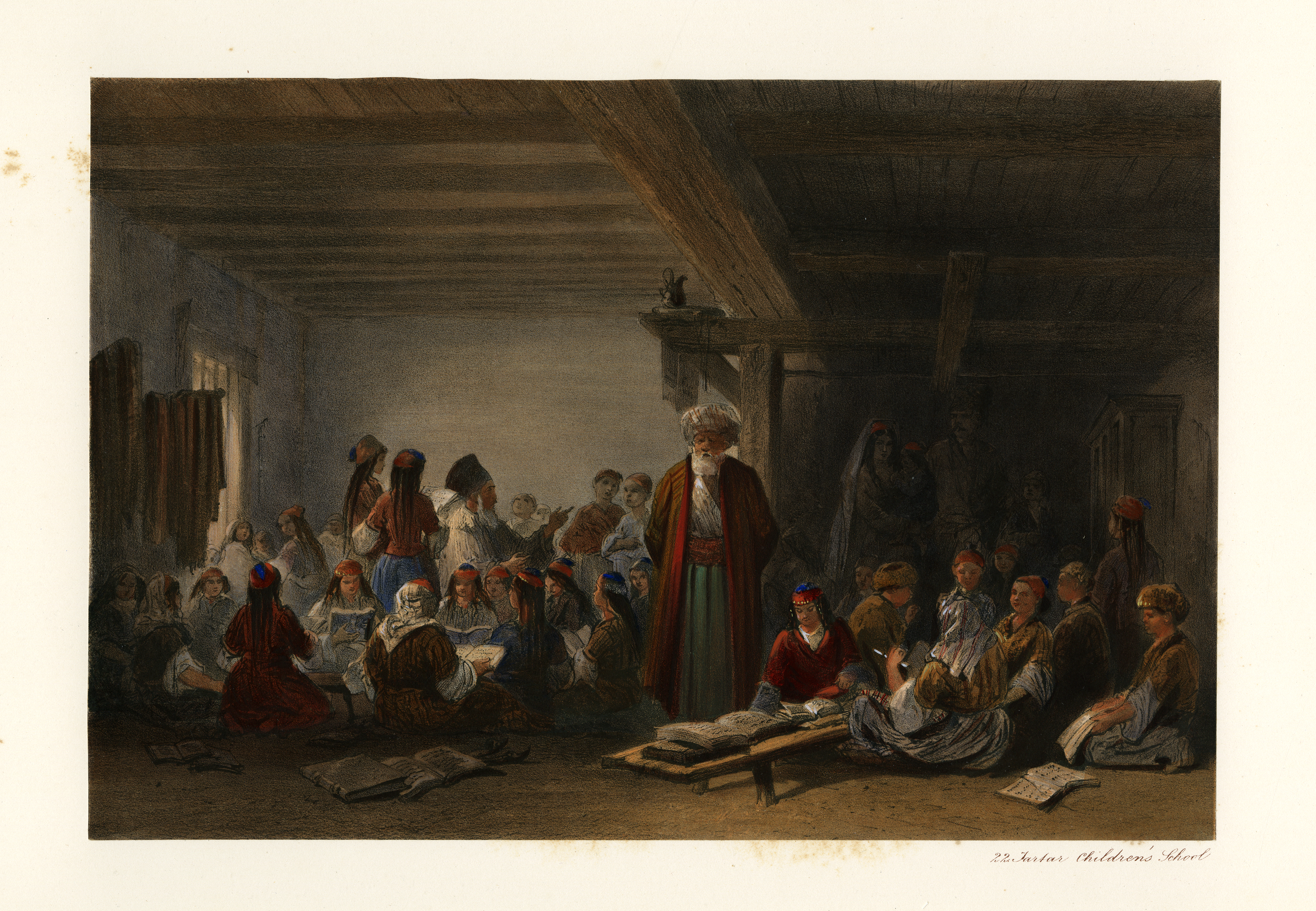 Interior view of a Tatar school. Crimean Tatar children of all ages cluster in groups listening to their teachers or reading. Books lie on low tables and on the floor.
