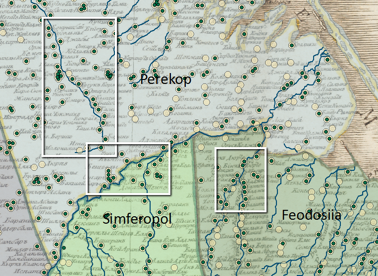The "mislocation" is clear in this map pairing, where villages shown on the Vil'brekht map appear as translucent yellow points. The smaller green points represent villages described in the registers. The second image is a detail map of Feodosiia district, where the match rate was particularly bad. The third image suggests that there was a good deal of continuity (or simply better documentation) along the major rivers such as the Salgir.