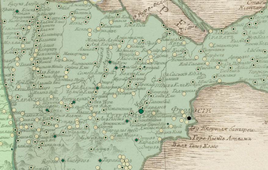 Vil'brekht's map is the best cartographic source I have found for the early post-annexation years. It is quite unique in its almost single-minded devotion to mapping villages, and I took the opportunity to digitize every point on the map, along with the corresponding toponyms.
